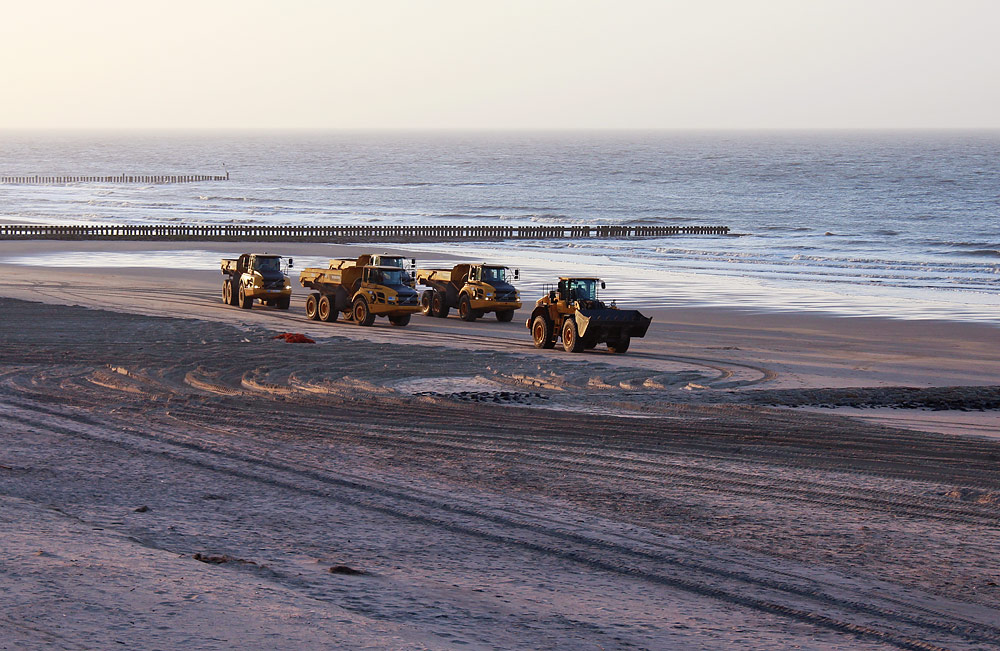 Vier Dumper und ein Radlader haben sich in Position gebracht. Die Schicht beginnt, gleich wird es in Richtung Oststrand gehen.