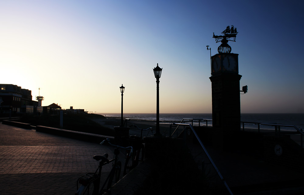 Die Hauptuhr an der Strandpromenade in der Abenddämmerung. Im Hintergrund erkennt man die Marine-Signalstation und links daneben das neu erbaute Aparthotel »Anna Düne«.