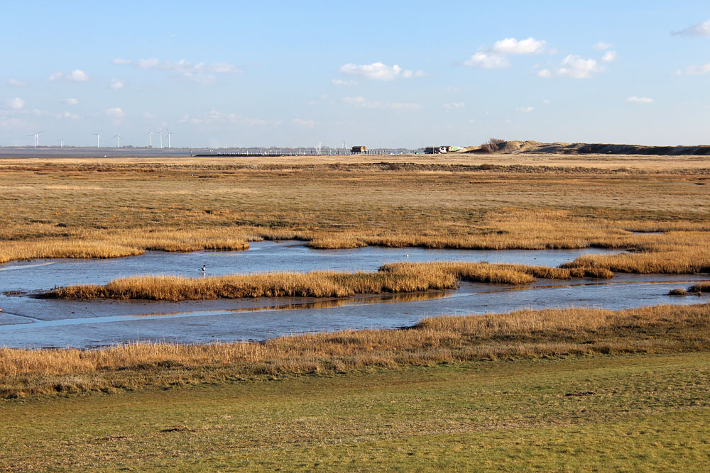 Im Hintergrund ist der Westanleger zu erkennen, davor der Westaußengroden mit den »Sporndünen«, einer flachen Dünenkette auf halber Strecke zwischen Deich und Anleger.