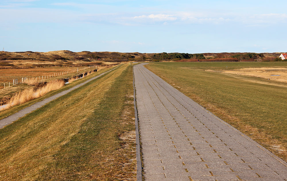Unser Weg zurück in Richtung Inseldorf führt uns über den Westgrodendeich. Links ist noch der alte Deichkronenweg erkennbar, er ist heute ein Fußweg.