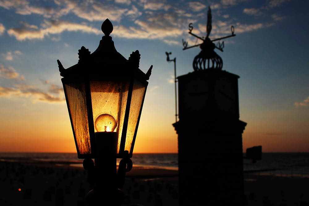 Die Uhr wird von zwei hübschen Laternen flankiert, eine davon ist hier im Bild festgehalten.