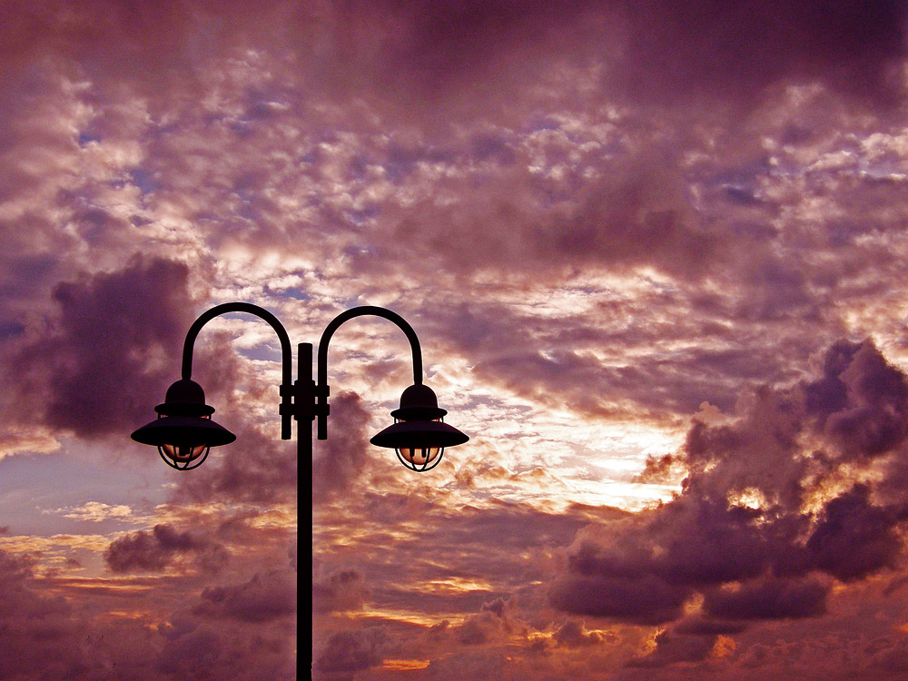 Hier eine der typischen, geschwungenen Straßenlaternen an der Strandpromenade, umrahmt von beeindruckenden Abendwolken.