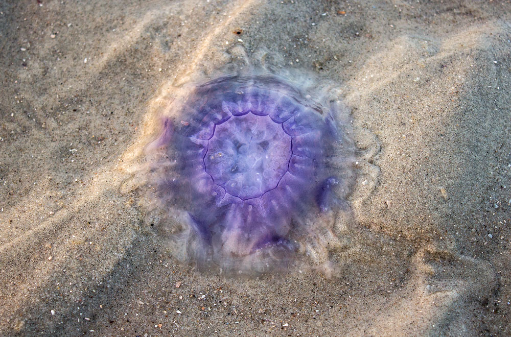 Immer wieder werden Quallen von der Brandung an den Strand angeschwemmt, hier ein Exemplar der in der Nordsee häufig vertretenen »Blauen Nesselqualle« (Cyanea lamarckii).