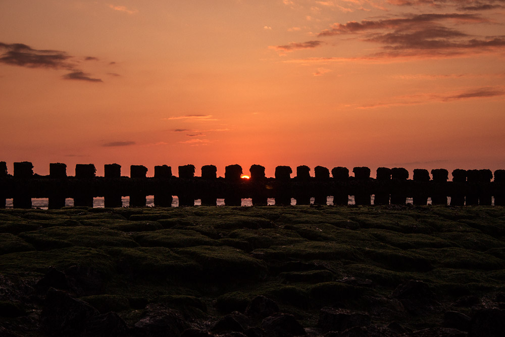 Die Sonne entschwindet langsam hinter der Pfahlbuhne bei Buhne »M«.