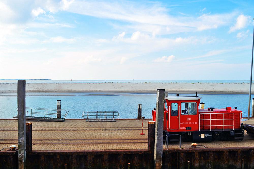 Die Inselbahn wartet bereits am Westanleger, gleich wird das Schiff an der Kaimauer anlegen und festgemacht werden.
