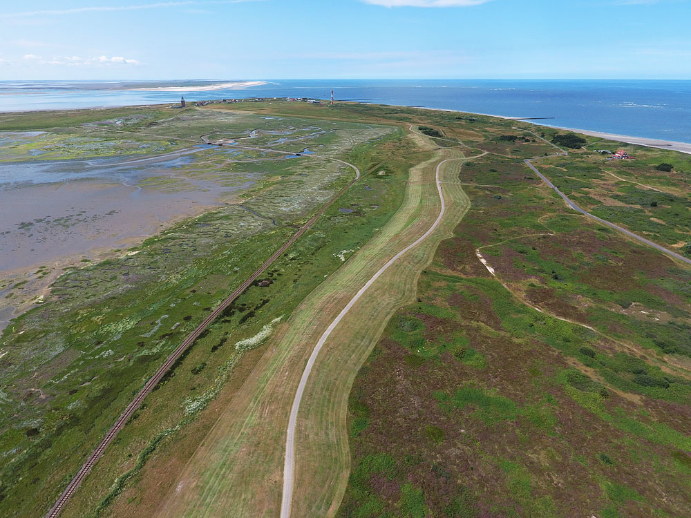 Blick auf den westlichen Teil der Insel. Im Hintergrund erkennt man die Nachbarinsel Spiekeroog und ein Stückchen davor das Westdorf mit Westturm und Neuem Leuchtturm. Links die Gleise der Inselbahn, rechts die »Straße zum Westen« und die »Saline«.