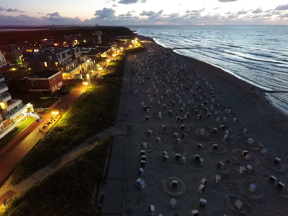 Unten am Strand hält sich jetzt am Abend kaum noch jemand auf, die Außen-Sitzplätze der Lokale an der hell beleuchteten Promenade sind dafür allerdings noch sehr gut bevölkert.