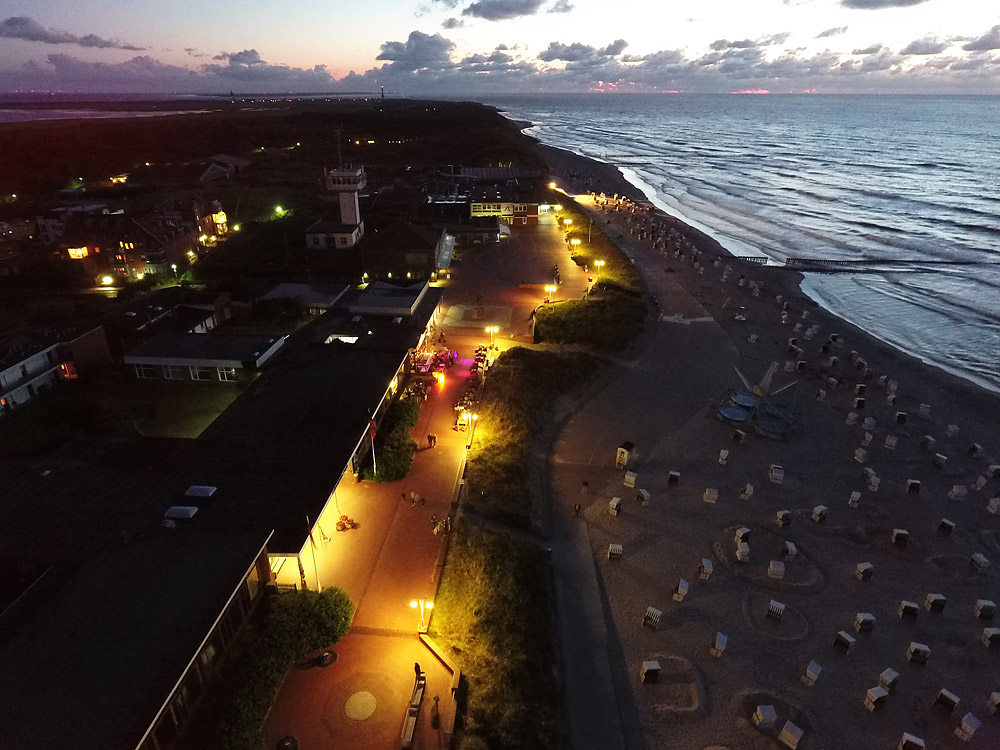 Hier sehen wir die Strandpromenade in Höhe der Kurverwaltung (unten links). In der Bildmitte erkennt man die Außensitzplätze des »Diggers«, dahinter befinden sich der »Navigator« sowie der »Platz am Meer«.