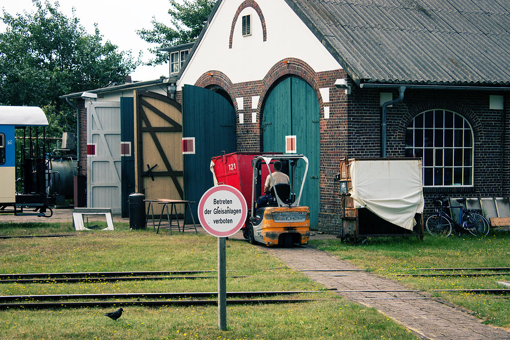 Der Gepäckcontainer hängt ja schon ein wenig auf halb acht. Aber macht nichts, solange er sich so transportieren lässt. Im Hintergrund der denkmalgeschützte Lokschuppen.