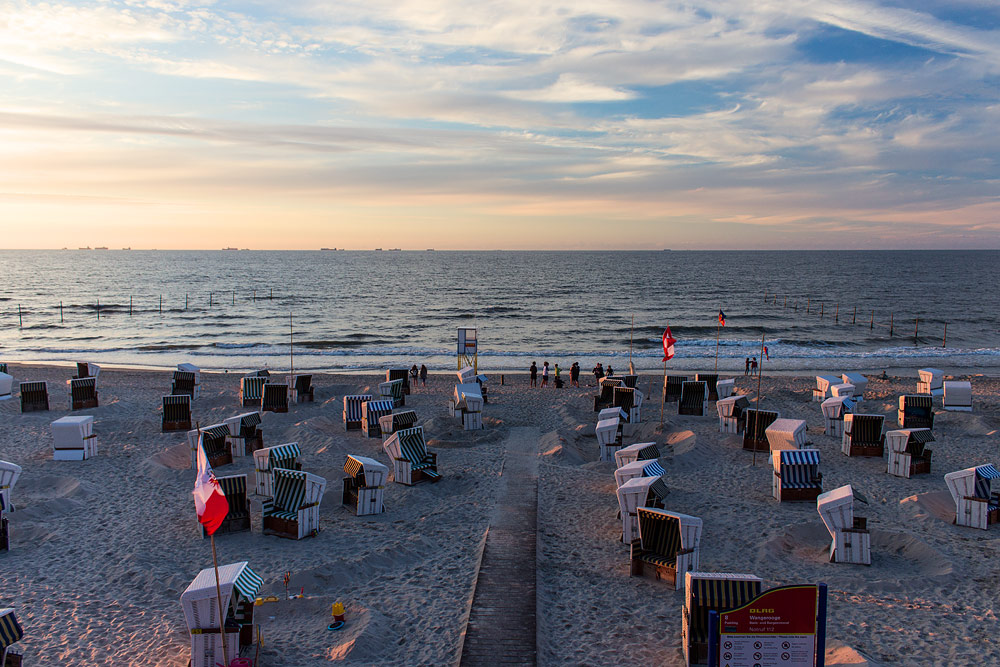 Unter uns der »Uhrsteg«, der geradewegs zum Hauptbadefeld führt. Bei dem schönen Wetter halten sich noch relativ viele Leute am Strand auf.