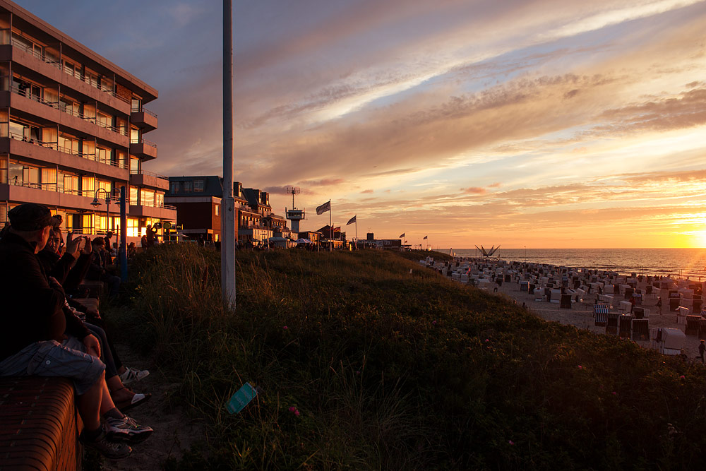 Auf der Strandpromenade stehen und sitzen zahlreiche Gäste und Insulaner, um dem stimmungsvollen Sonnenuntergang beizuwohnen.