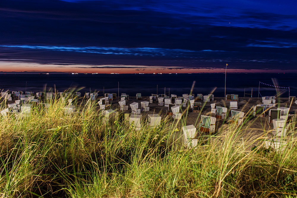 Hier ein Blick von der Mauer an der Strandpromenade hinunter auf das Strandkorb-Westfeld. Im Hintergrund erkennt man die Beachvolleyball-Felder, dahinter die Meeresbrandung und am Horizont leuchten die auf Reede liegenden Schiffe.