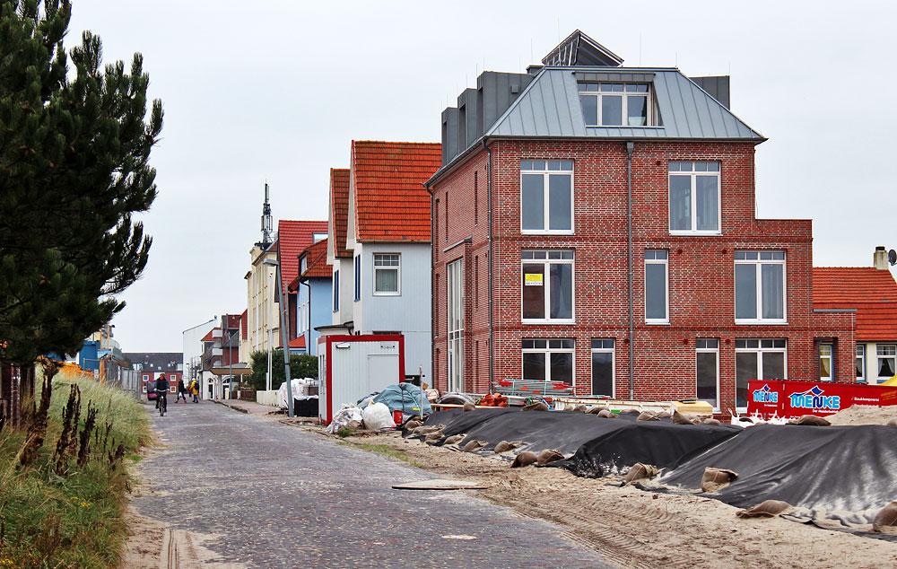 Wir befinden uns in der »Peterstraße«, Höhe »Polizeiwiese«. Rechts werden zum Zeitpunkt der Aufnahme gerade die Ferienvillen »Anna Düne« gebaut, mittlerweile sind sie selbstverständlich fertig gestellt.