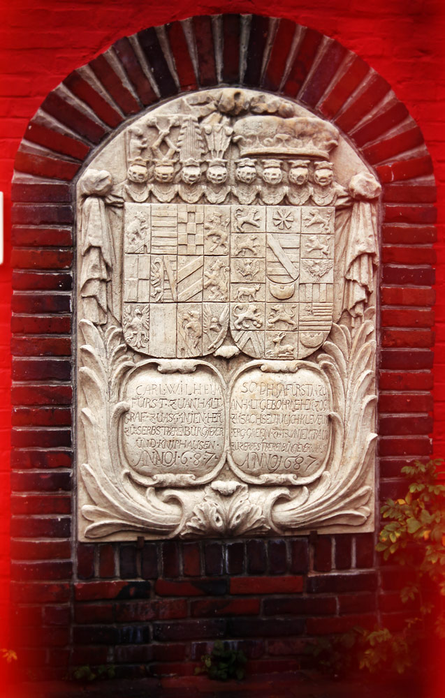 ‹ Außer in den Leuchtturm von 1830 und in den Neuen Leuchtturm war dieser Wappenstein von 1687 in alle Wangerooge Leuchttürme eingemauert. Er trägt das Ehewappen von Carl Wilhelm, Fürst zu Anhalt, Graf zu Ascanien, Herr zu Zerbst, Berenburg, Jever und Kniphausen und seiner Ehefrau Sophie, Fürstin zu Anhalt, geb. Herzogin zu Sachsen, Jülich, Cleve, Berg, Gräfin zu Ascanien, Frau zu Zerbst, Berenburg, Jever und Kniphausen.