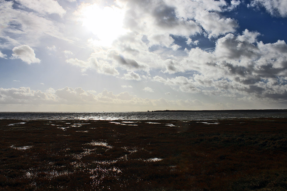 Während der Inselbahn-Fahrt zum Westanleger, der im Hintergrund bereits zu sehen ist, durchquert man die Salzwiesen im Deichvorland.