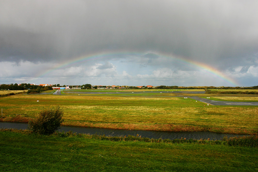 Ein Regenbogen überspannt den Ostinnengroden mit Flugplatz und Rollbahn, im Hintergrund erkennt man außerdem die Graslandebahn »02/20«.