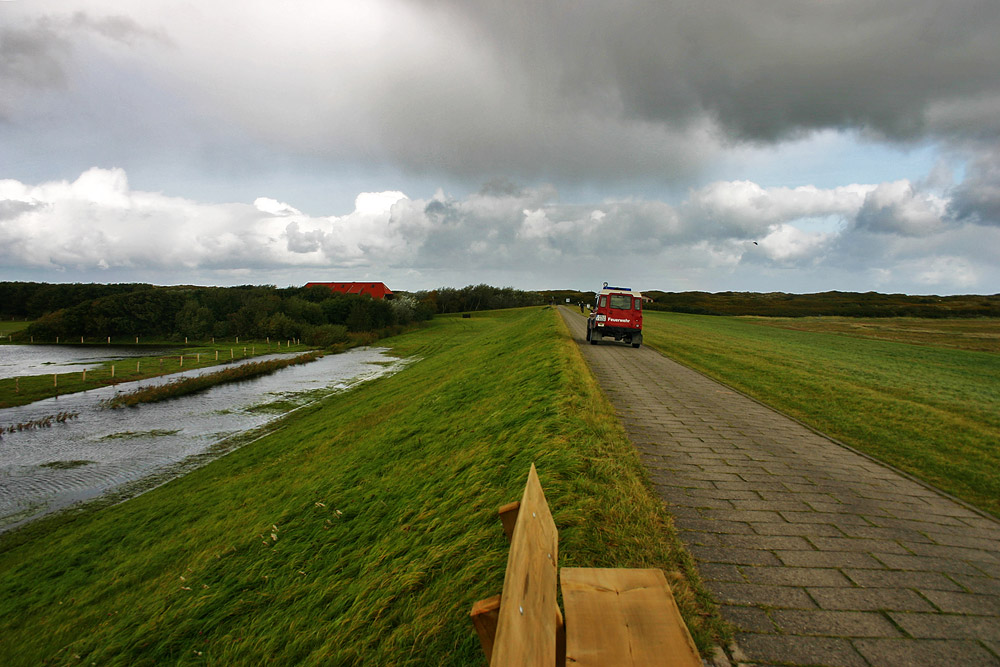 Die Feuerwehr nähert sich Neudeich, die Kontrollfahrt um den Deich umzu ist gleich beendet.