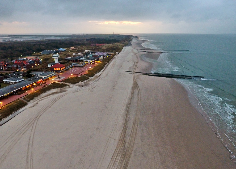 Luftaufnahme vom Hauptstrand und dem Surfstrand sowie darüber hinaus. Links die Gemeinde- und Kurverwaltung, die Signalstation und das Schwimmbad, im Hintergrund ragen die beiden Türme des Inselwestens empor.