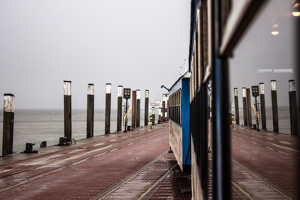 Das Gepäck wird gerade von der »MS Harlingerland« auf den Zug umgeladen, in der Zwischenzeit ist Warten angesagt. Im Hintergrund sieht man das Heck der »MS Wangerooge«, die sich mit voller Fahrt von der Insel verabschiedet.