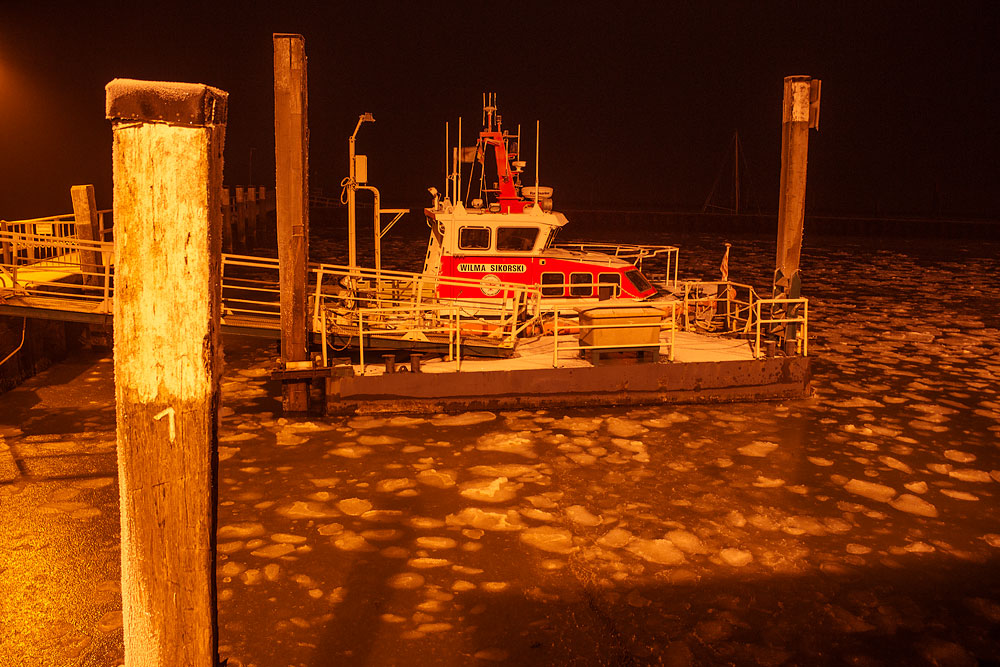 Das Rettungsboot »Wilma Sikorski« wird vom gelben Licht der Natriumdampf-Hochdrucklampen erhellt. Im Hafenbecken haben sich durch konstant niedrige Temperaturen bereits Eisschollen gebildet.