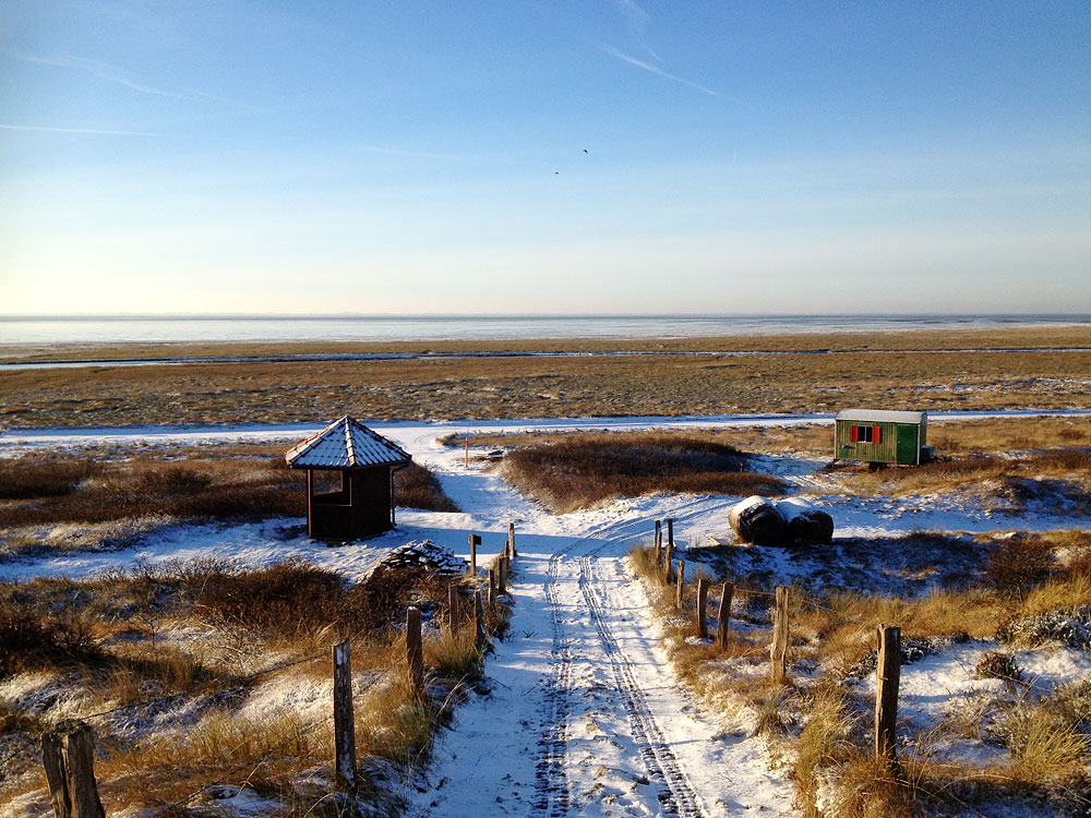 Der grüne Bauwagen rechts im Bild verrät, daß diese Dünenüberwegung gerade vom Wasser- und Schiffahrtsamt in Stand gesetzt wird – das Ganze bei wunderbarem Winterwetter.