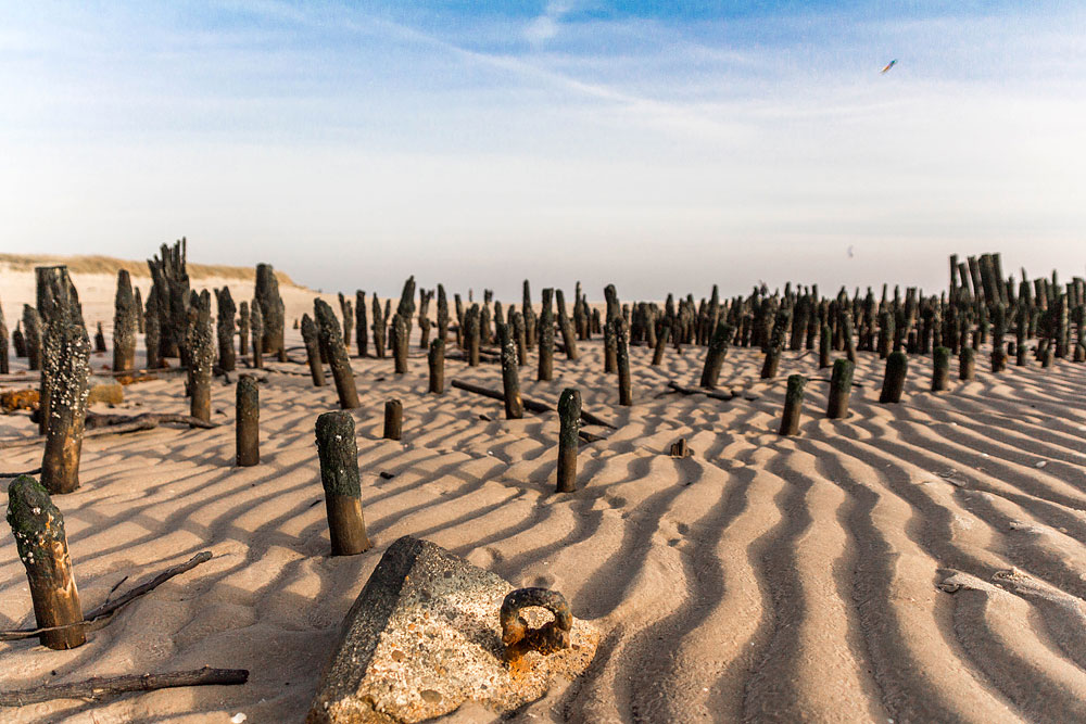 Neben zahllosen Pfählen findet sich hier auch ein verrosteter Haken an einem Betonklotz – was daran wohl einmal festgemacht worden sein mag?