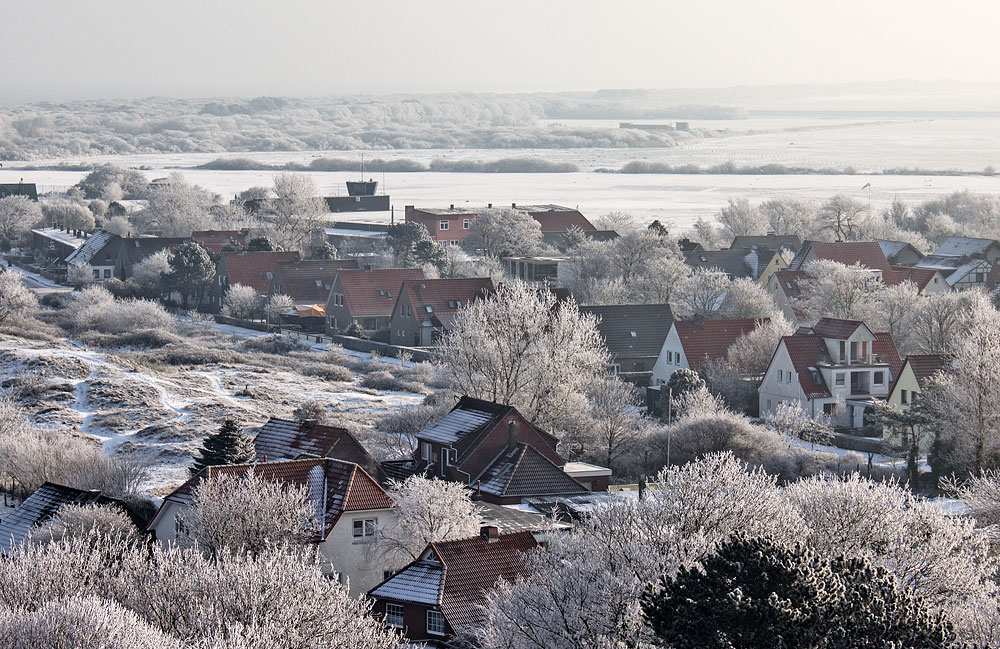 Wir blicken nun vom Alten Leuchtturm zur »Siedlerstraße«, die größtenteils nur auf ihrer Südseite bebaut ist. Auf der gegenüberliegenden Straßenseite befindet sich u. a. eine Dünenlandschaft mit einigen Bunkern, die allerdings meist unter Sand versteckt sind.