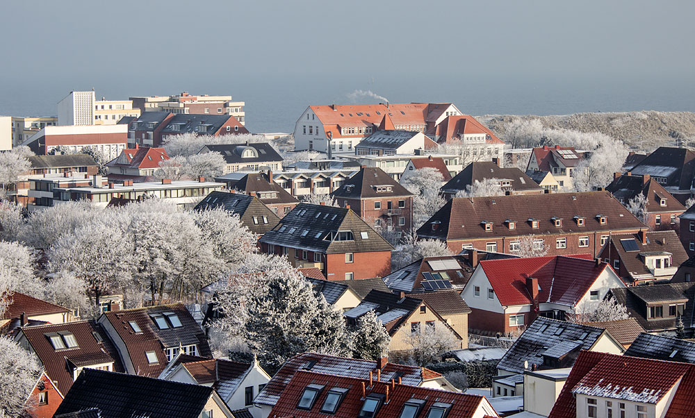 Wir blicken nun vom Leuchtturm aus in nordöstliche Richtung und sehen im Hintergrund die katholische St. Willehad-Kirche (links) sowie das Haus »Meeresstern« mit rauchendem Schornstein.