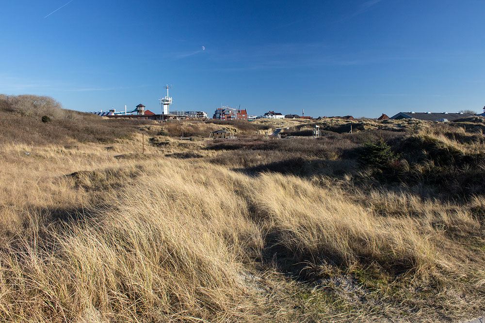 Wir schauen von Westen her auf den Abenteuerspielplatz und das Dorf mit Signalstation und Meerwasser-Freizeitbad.