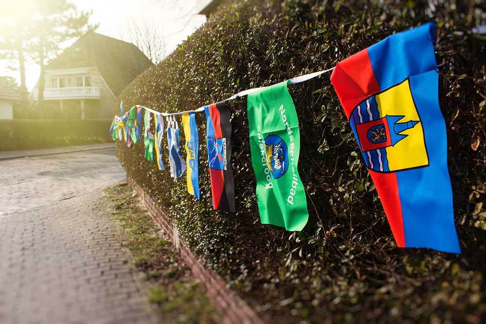 Anläßlich des Insulanertreffens »Insulaner unner sück« auf Wangerooge hingen im Frühjahr 2016 überall auf Wangerooge die Flaggen aller Ostfriesischen Inseln, so auch an einer Hecke im »Bootsweg«. Von vorn nach hinten sehen wir die Flaggen von Wangerooge, Spiekeroog, Langeoog, Baltrum, Norderney, Juist und Borkum.