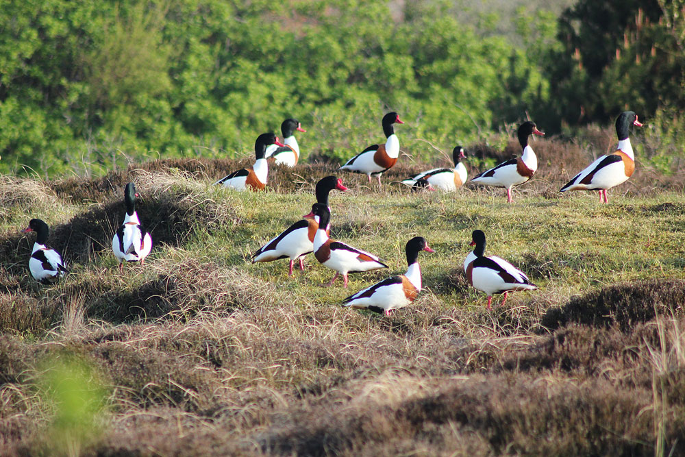 Eine Gruppe von Brandgänsen in den Wangerooger Heidedünen. Männchen und Weibchen unterscheiden sich bei dieser Gänseart kaum, die Männchen sind allerdings bis zu einem Drittel größer.
