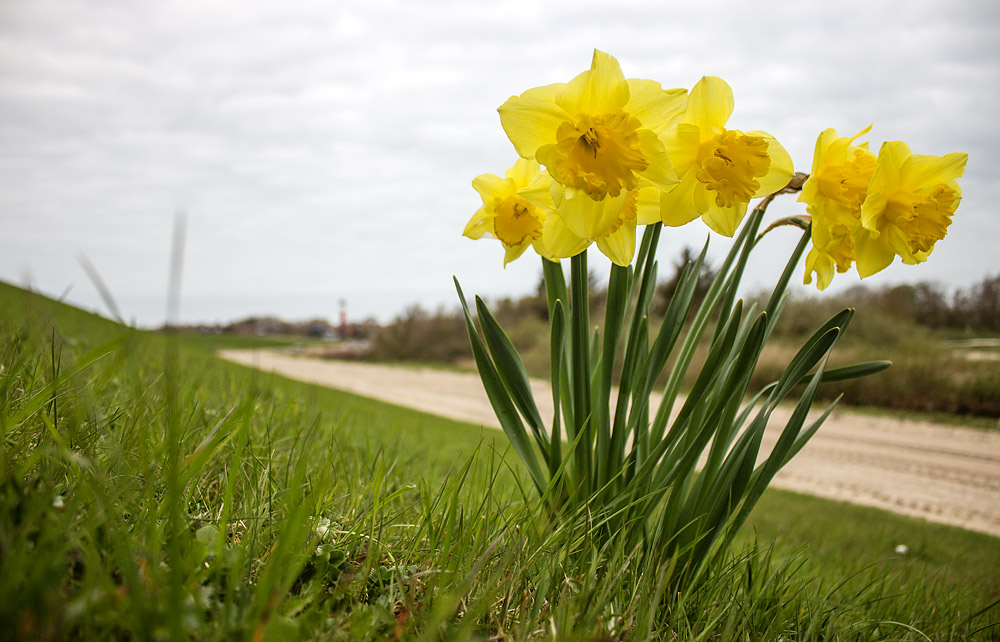 Ein Blick zurück in den April: Noch ist dieses Teilstück des Deiches für Spaziergänger und Radfahrer geöffnet, im Sommer 2017 werden hier dann Deichbauarbeiten stattfinden. Im Vordergrund sehen wir einige Narzissen, jetzt im April blühen sie besonders schön.