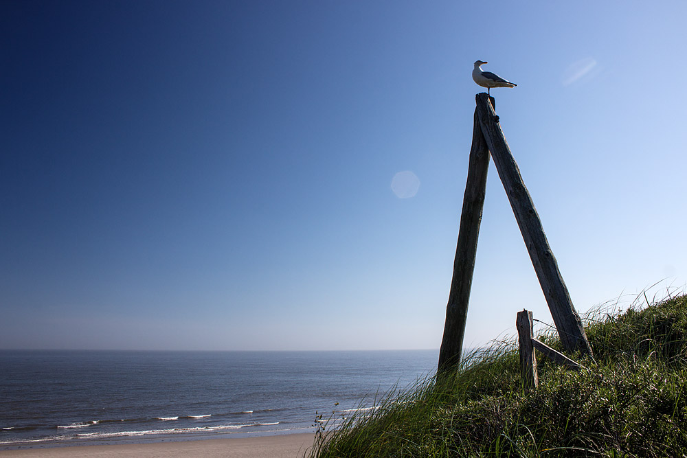 Die Silbermöwe hat vom A-Mast aus eine ganz gute Aussicht über Dünen und Strand, diesen Rundblick genießt sie auch sichtlich.