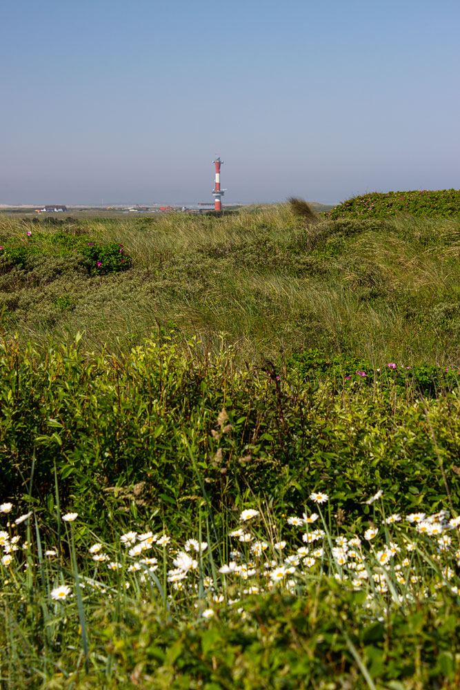 ‹ Vorn sehen wir noch einmal die Margeriten, die am Rande der Dünenüberwegung wachsen. Im Hintergrund ist der Neue Leuchtturm zu sehen.