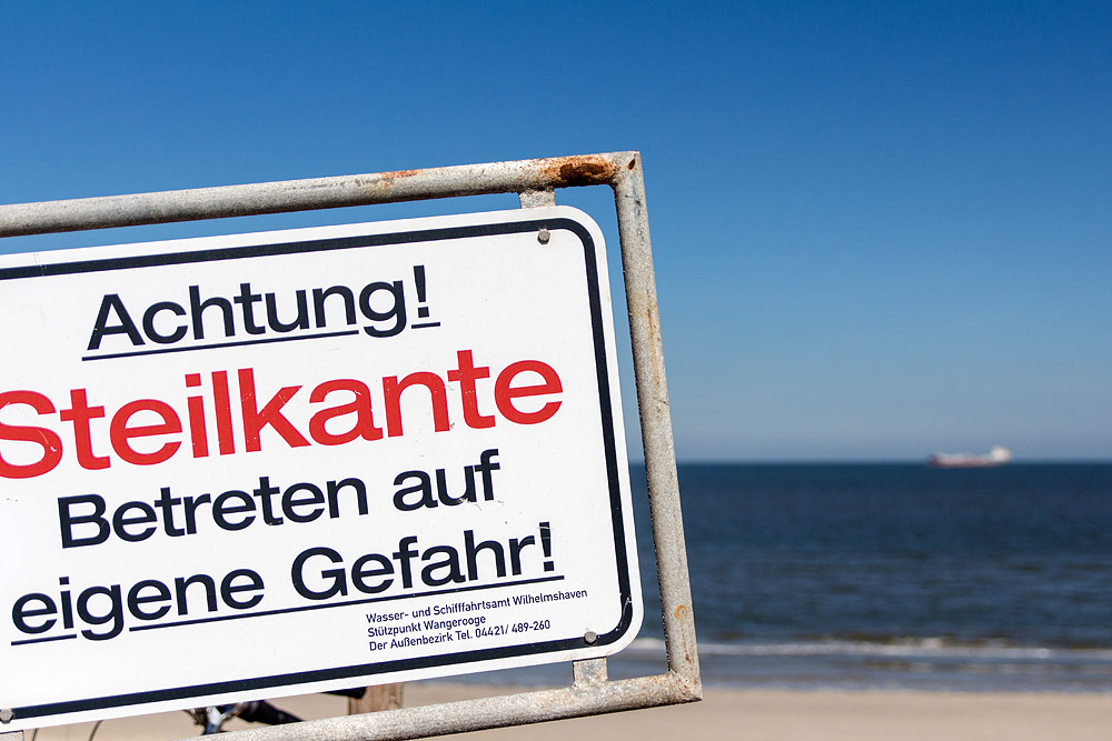 »Achtung! Steilkante – Betreten auf eigene Gefahr!« – nach den Wintersturmfluten wurden noch nicht alle Dünenüberwegungen wieder hergerichtet, daher warnt dieses Schild des WSA vor den Gefahren.
