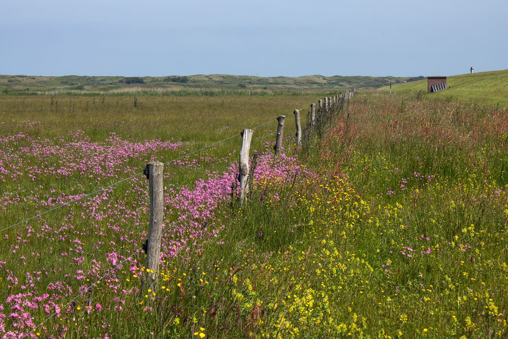 Wir stehen am Fuße des Westgrodendeichs und blicken nach Norden. Links befindet sich eine Viehweide, die in den Sommermonaten von zahlreichen Färsen bevölkert wird, derzeit wachsen dort aber noch unzählige »Kuckucks-Lichtnelken«.
