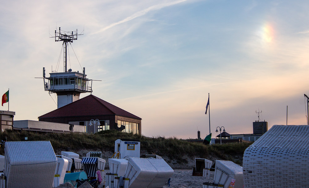 Rechts oben im Bild ist eine sogenannte »Nebensonne« zu erkennen, sie befindet sich etwa 22 Grad links von der »echten« Sonne. Diese Haloerscheinung wird durch Eisplättchen hervorgerufen, die sich in hohen Atmosphärenschichten befinden, das Licht der tiefstehenden Sonne bricht sich darin.