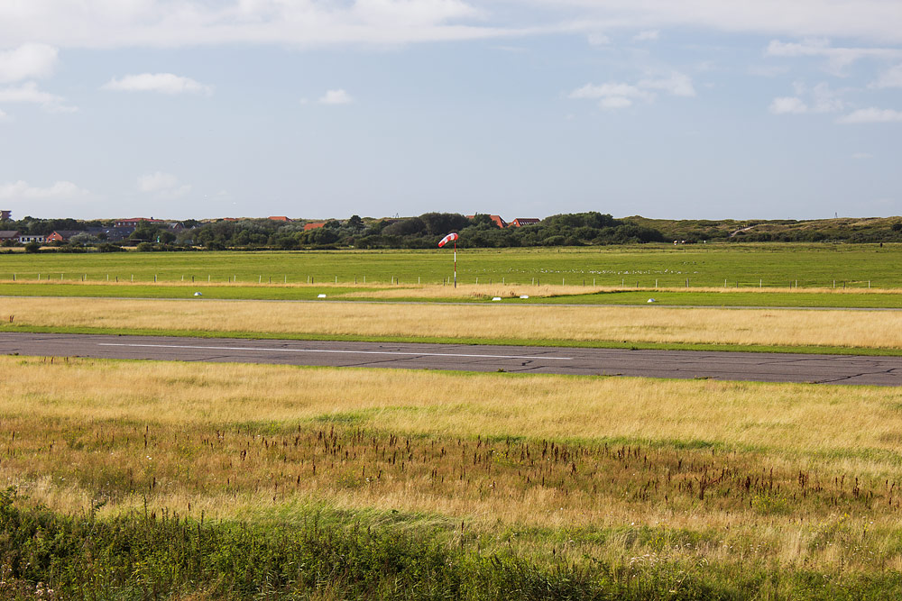 Blick vom Deich auf den Ostinnengroden. In der Bildmitte sehen Sie die Start- und Landebahn des Flugplatzes sowie den Windsack.
