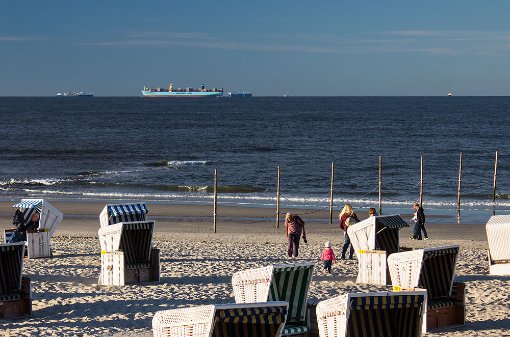 Vom Hauptstrand aus hat man einen schönen Blick auf die Reede, die Ankerplätze für die Schiffe, die in Kürze in die Seehäfen von Jade und Weser einlaufen werden.