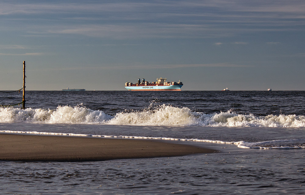 Ein Containerschiff der »Mærsk Line« auf dem Weg in Richtung Wilhelmshaven. Das Foto entstand von der Buhne »O« aus, links sehen Sie einen Teil der Hauptbadefeld-Begrenzung.