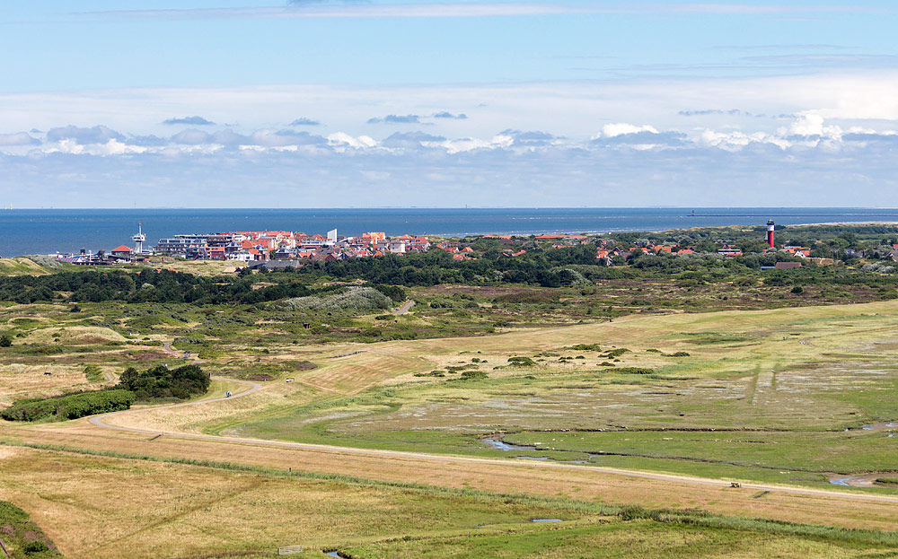 Ziemlich genau in der Mitte der Insel befindet sich das Dorf, dessen rote Dächer schon von weitem zu erkennen sind. Vorn der Westgrodendeich, der den Westinnengroden (unten) vom Westaußengroden mit Lagune trennt.