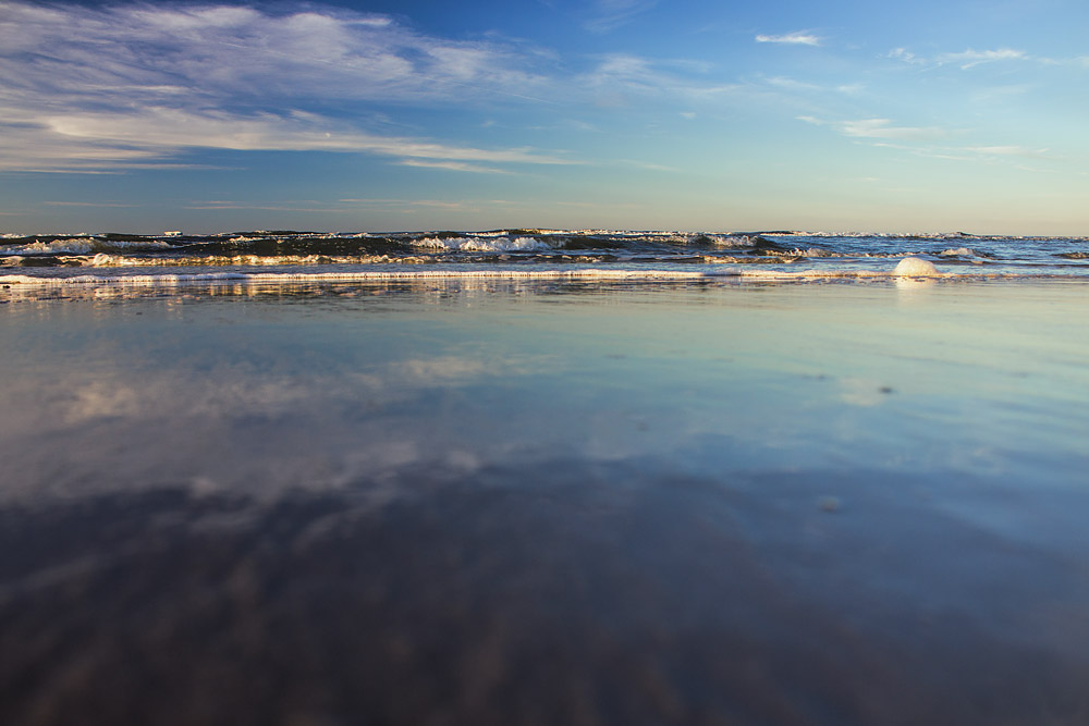 Dieses Foto entstand bei Niedrigwasser im Hauptbadefeld, direkt an der Wasserkante. Die Wolken am Himmel spiegeln sich im nassen Sand, im Hintergrund branden kleine Wellen an den Strand.