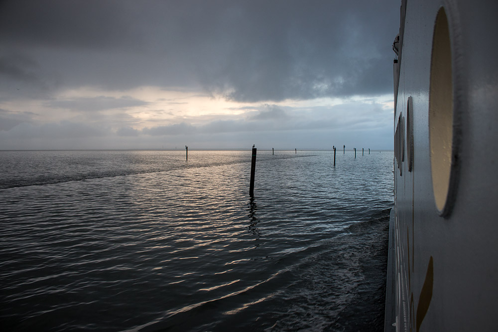 Während der Überfahrt zur Insel lehnen wir uns an der Backbordseite des Schiffs über die Reling und schauen in Fahrtrichtung. Links der Steindamm, der die Fahrrinne vor Versandung schützt.
