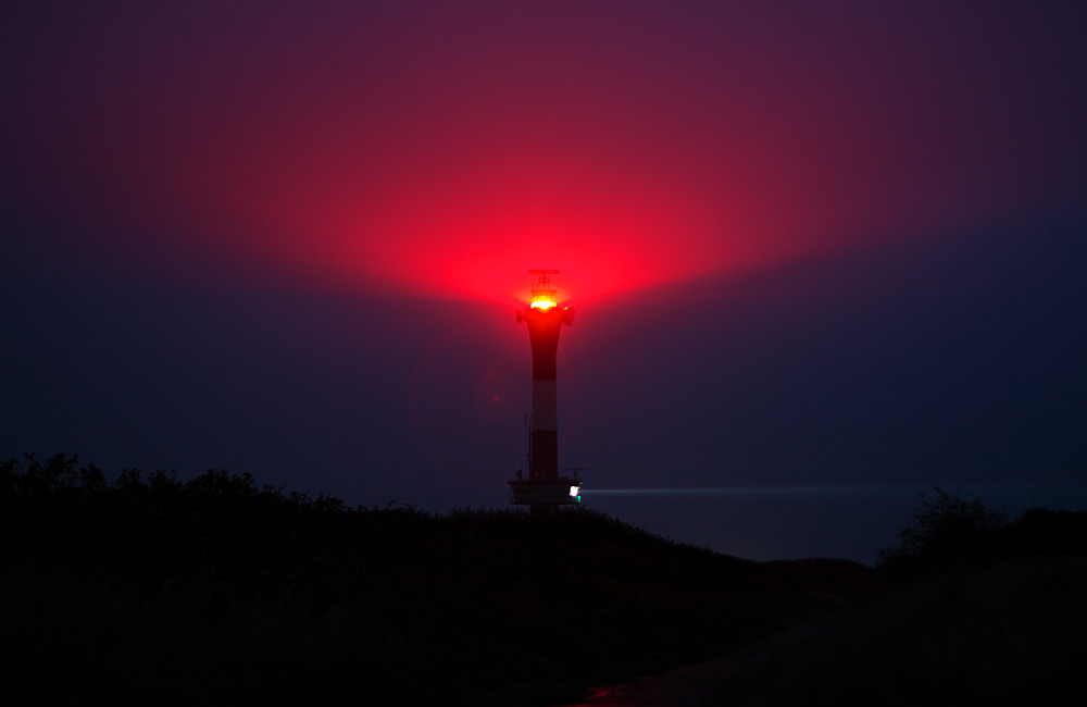 Auf dieser Abendlichen Aufnahme des Neuen Leuchtturms erkennt man nicht nur den roten Schein des Seefeuers, sondern auch den Schein des nach Nordwest gerichteten Leitfeuers im auskragenden Mittelgeschoß.