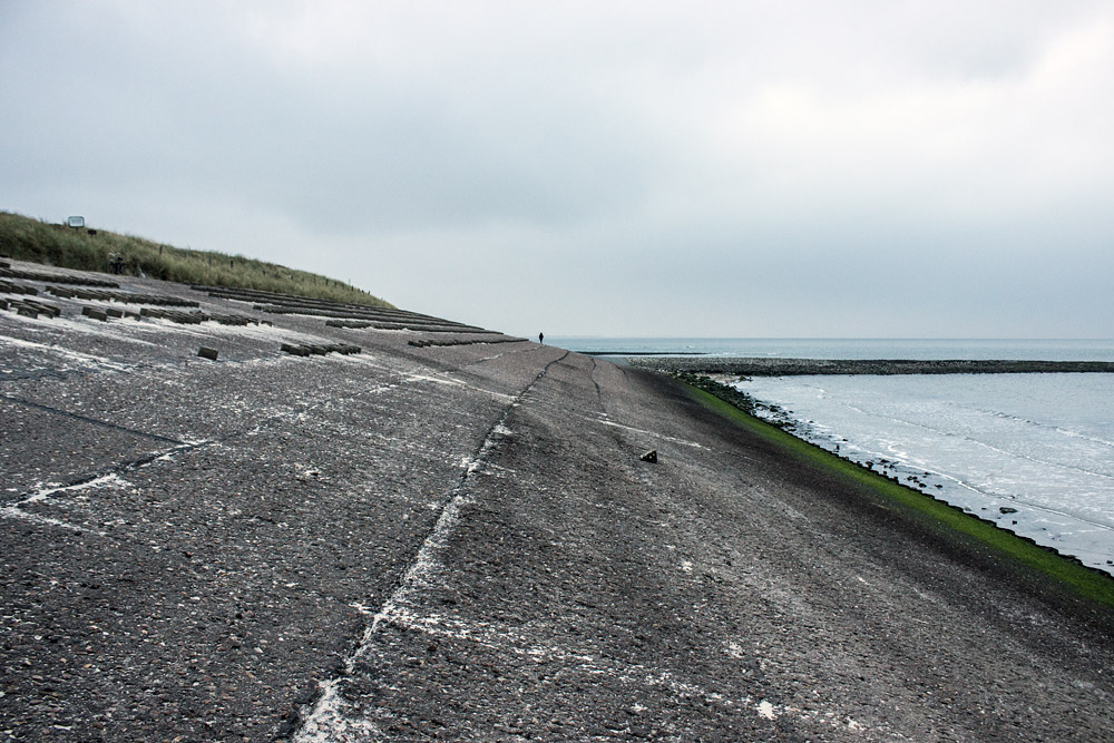 Wir befinden uns hier auf dem asphaltierten Westdeckwerk, rechts ist die Buhne »B« zu erkennen.
