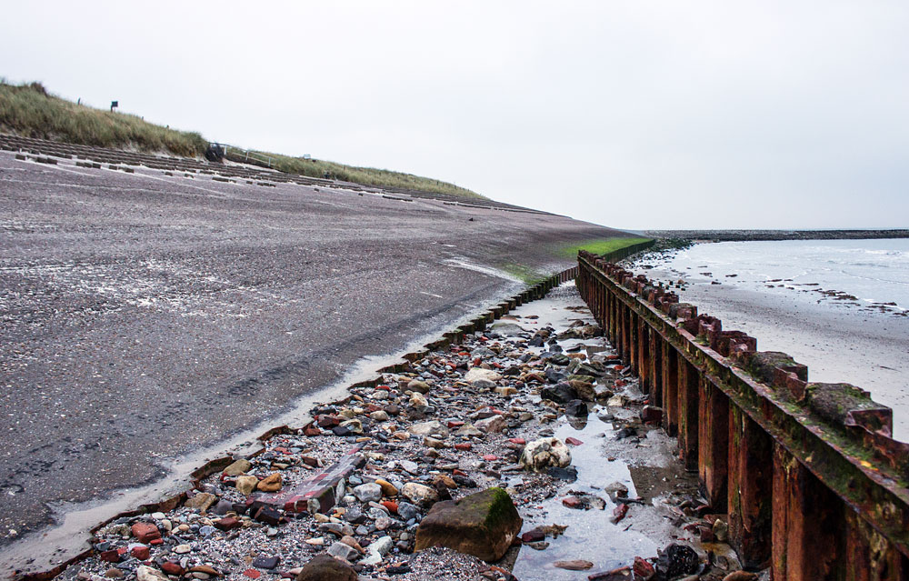 Wir stehen nun direkt am Fuß der Buhne »G«, vor uns die rostige Spundwand, die sich rechts und links Buhne befindet. Im Hintergrund ist die Nachbarbuhne »B« erkennbar.