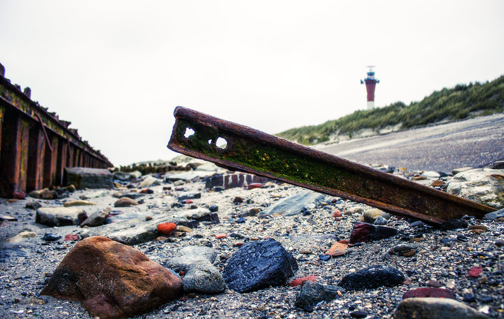Wir befinden uns weiterhin am Fuß des Deckwerks in der Nähe der Buhne »G«. Eine uralte, rostige Bahnschiene ragt aus dem Deckwerk hinaus, woher sie wohl stammen mag?