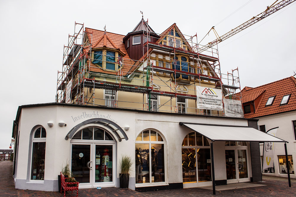In diesem Gebäude in der oberen »Zedeliusstraße« befindet sich die »Inselbuchhandlung«, zum Aufnahmezeitpunkt war dort außerdem der »Camel Active Store« untergebracht. Die oberen Stockwerke des Hauses werden hier gerade umgebaut, dabei wurden historische Original-Entwürfe von 1905 verwendet.