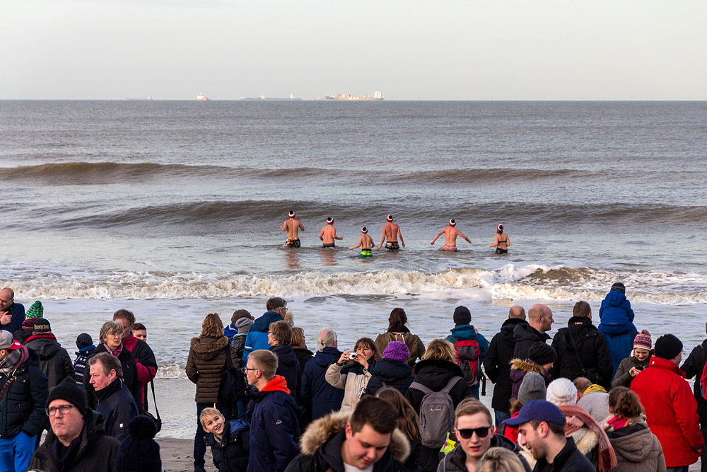 Die meisten der 132 Badenden haben das Wasser bereits wieder verlassen, diese sechs tragen allerdings Wollmützen und halten dadurch naturgemäß viel länger durch!