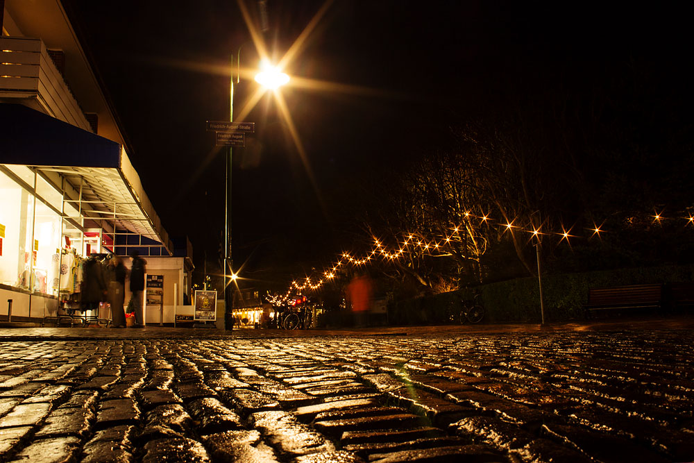 Wir befinden uns hier auf der Kreuzung der »Zedeliusstraße« mit der »Friedrich-August-Straße«, eine Lichterkette in den Bäumen des Rosengartens vermittelt weihnachtliche Atmosphäre, trotz Regens.